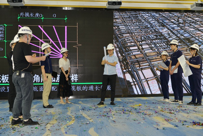 劇目《看全咨》,把現(xiàn)場觀眾帶回了工地施工現(xiàn)場。面對困難,他們從未退縮,堅持把事情做成、把事情做好,堅守“結(jié)果導(dǎo)向”的核心價值觀,運(yùn)用扎實的專業(yè)知識解決工程難題。在劇里,他們獲得業(yè)主好評,在現(xiàn)實工作中,他們?nèi)耘f獲得業(yè)主夸贊。