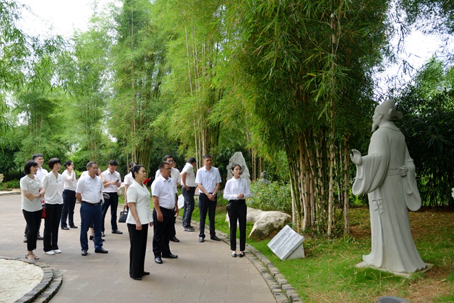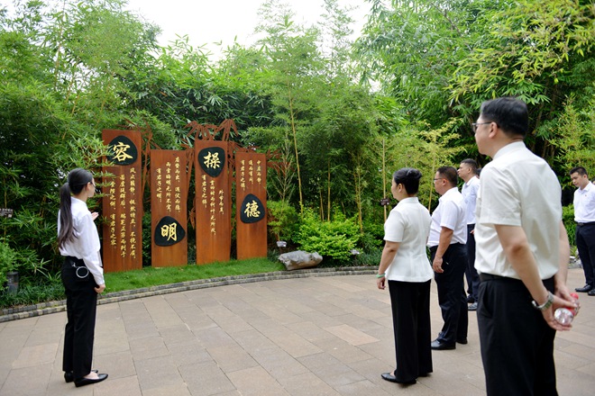 當(dāng)天,南寧路橋公司黨總支部書記、董事長韋敏生,云之龍咨詢集團(tuán)黨支部書記、總裁王鐿霖與黨員同志們共同參觀了廉潔文化主題園。園中竹林翠綠,清廉官員雕塑挺立其中,詠竹詩詞繪刻于墻,展現(xiàn)古往今來的“廉竹精神”,突顯“清廉”主題。
