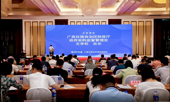 峰會以“強化主體責(zé)任·優(yōu)化營商環(huán)境”為主題。廣西壯族自治區(qū)財政廳政府采購監(jiān)督管理處處長文學(xué)權(quán)以《以政府采購監(jiān)管“硬約束” 提升營商環(huán)境“軟實力”》為題,做主旨演講。