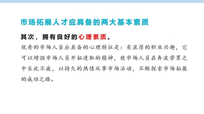 市場拓展人才專項培訓(xùn)則主要針對市場拓展人才應(yīng)具備的基本素質(zhì)和能力,市場拓展技巧,應(yīng)酬的七大黃金法則,如何更好地建立客戶管理體系。