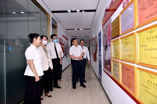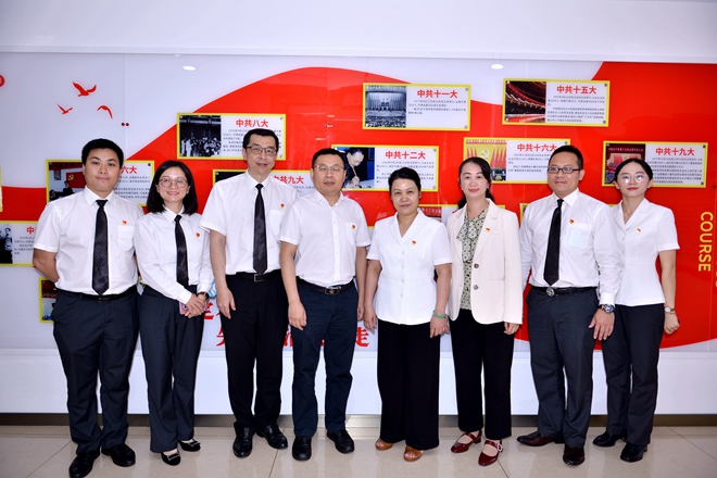 王鐿霖總裁(左一)帶領(lǐng)授課老師參觀黨建長廊