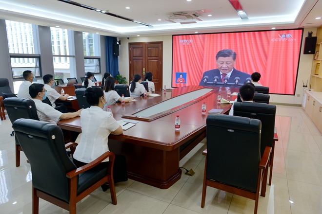 在云之龍集團(tuán)總部五樓多功能廳,黨員們圍坐一起,共同見證這一歷史時(shí)刻,感受著團(tuán)結(jié)、和諧、奮進(jìn)的時(shí)代脈動(dòng),處處洋溢著歡快、幸福、自豪的氣氛。在直播期間,與會(huì)人員聚精會(huì)神觀看,不時(shí)為報(bào)告內(nèi)容所打動(dòng)、所振奮。
