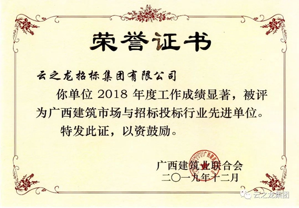 云之龍集團(tuán)再次被評(píng)為“2018年度廣西建筑市場與招標(biāo)投標(biāo)行業(yè)先進(jìn)單位”,這是集團(tuán)連續(xù)第九年獲得此殊榮。此外,集團(tuán)項(xiàng)目經(jīng)理韋成曉獲得“先進(jìn)個(gè)人”稱號(hào)。