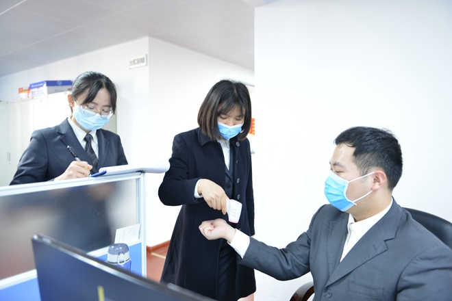 我們根據(jù)集團(tuán)要求,準(zhǔn)備了足夠的口罩、84消毒液、酒精、額溫槍、一次性手套等防疫用品;在開工前,對員工14天內(nèi)的行程及接觸信息排查;辦公室每天都會用消毒液進(jìn)行消毒,用酒精擦桌子、門把等位置;所有工作人員每天進(jìn)行兩次(上午、下午)測量體溫,并全程戴好口罩;食堂里分批就餐。