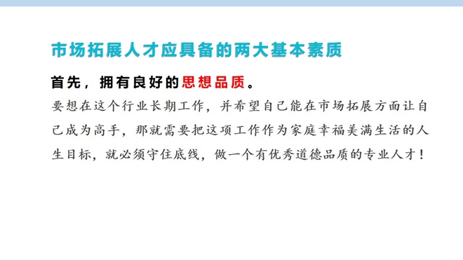 市場拓展人才專項培訓(xùn)則主要針對市場拓展人才應(yīng)具備的基本素質(zhì)和能力,市場拓展技巧,應(yīng)酬的七大黃金法則,如何更好地建立客戶管理體系。