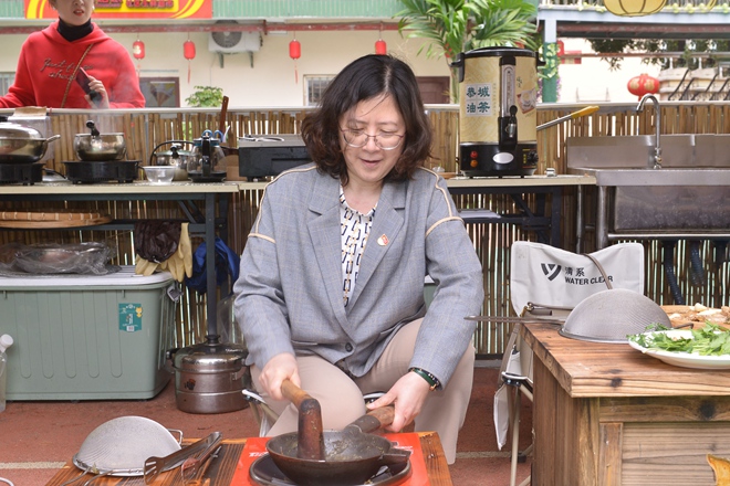活動當天,黨員同志在社區(qū)工作者的帶領(lǐng)下學(xué)習非遺油茶的制作,先將茶葉輕輕翻炒,然后加入蔥、姜一起捶打,直至水分蒸發(fā),炒出香味,再加入熱水煮沸,最后過濾茶葉,一碗香噴噴的油茶就做好啦。