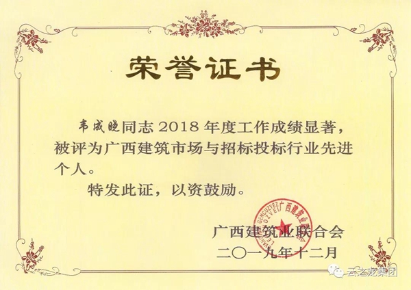 云之龍集團(tuán)再次被評(píng)為“2018年度廣西建筑市場與招標(biāo)投標(biāo)行業(yè)先進(jìn)單位”,這是集團(tuán)連續(xù)第九年獲得此殊榮。此外,集團(tuán)項(xiàng)目經(jīng)理韋成曉獲得“先進(jìn)個(gè)人”稱號(hào)。
